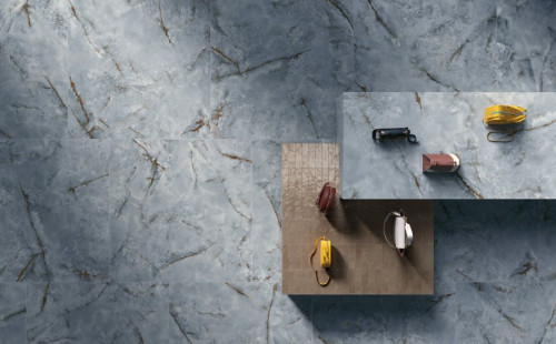 HPM2 ONICE AZZURO SHINE- 120x260- A mély kék azúr nyugalmat áraszt, a fehér a tisztaságot és az új kezdetet jelképezi; a nagy magasfényű csempe felülete változó megjelenést ad.