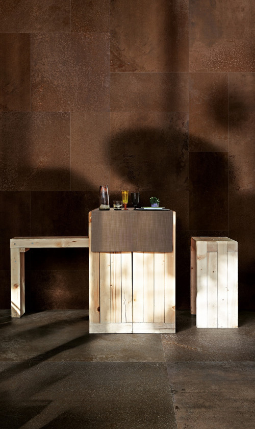 LAMINAM OXIDE MORO 100x300; Az Oxide Moro felülete a természetes oxidációt idézi, mély barna, rozsdás és szürkés árnyalataival elegáns, karakteres és modern hangulatot teremt fürdőszobában, nappaliban vagy teraszon.