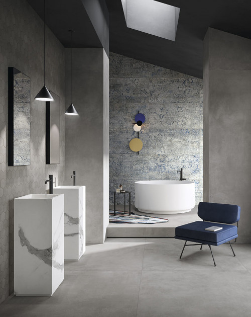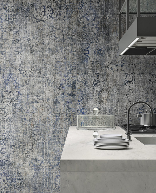 SEVENTYNINE- 120x260- A Seventy-nine modern, minimalista stílusú nagy csempe, neutrális kőhatású árnyalatokkal. A szürke stabilitást és eleganciát ad, a kék nyugalmat teremt, míg a matt, anyagszerű felület letisztult, harmonikus összhatást biztosít.