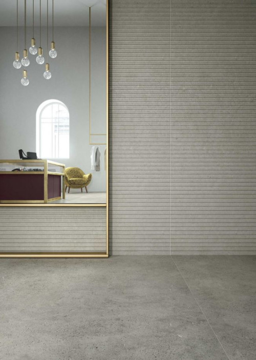 MATRICE RILIEVO 40x180 - Ez a nagy matt csempe finom barázdáival a tengerparti homok redőit idézi, lágy bézs színe pedig elegáns, időtlen és nyugalmat sugárzó hátteret biztosít, jól kombinálható más színekkel és kiegészítőkkel.