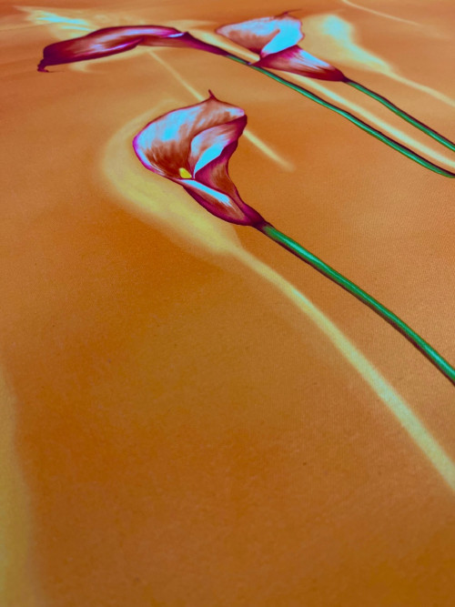 A Sunset Calla sötétítőfüggöny intenzív narancs árnyalatait lágy átmenetek és elegáns, festett hatású kála virágok teszik különlegessé. A rózsaszín és fehér tónusokban megjelenő virágmotívumok élénk, mégis harmonikus hangulatot teremtenek. Az anyag kiválóan zárja ki a napfényt, így ideális választás azoknak, akik otthonukba egyedi, természet ihlette dekorációt keresnek.