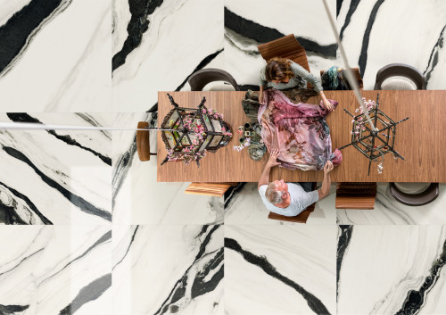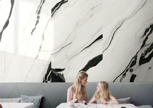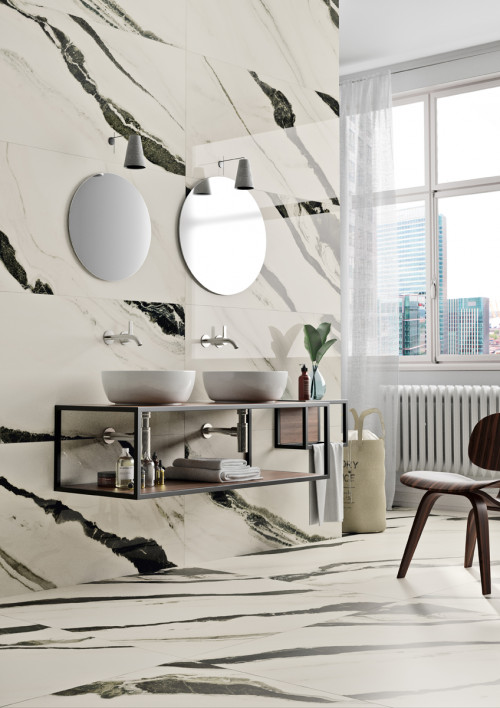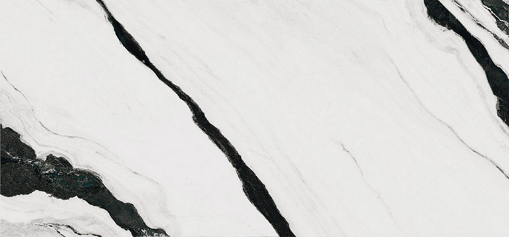 THE ROOM-Panda White 120x260- Ez a nagy csempe a panda mintáját idézi: fehér alapon fekete csíkokkal. A fehér lágyságot, a fekete erőt sugall, klasszikus, időtálló választás, amely mindig divatos marad.