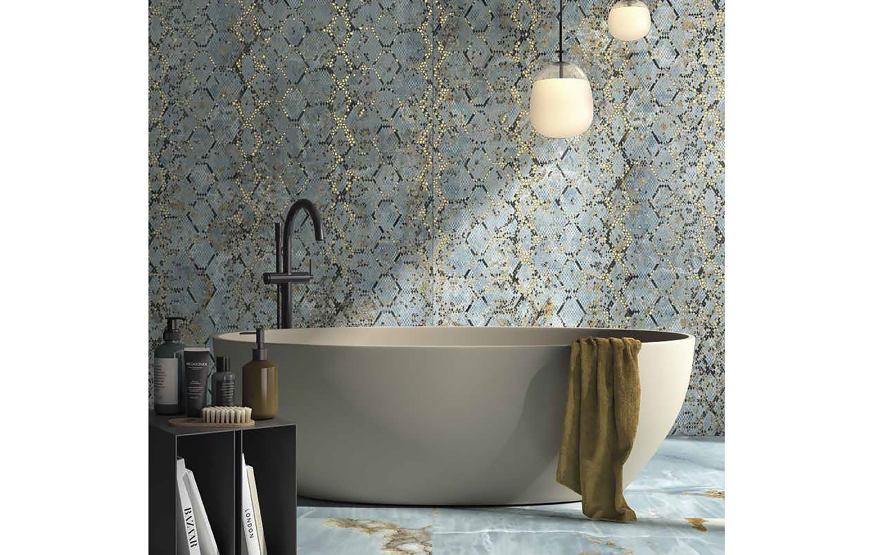 THE ROOM Python- 120x260 Ez a nagy csempe színes kígyóbőr mintáját idézi, fehér, kék, arany és bézs árnyalatokkal. A fehér tágítja a teret, a kék nyugalmat ad, az arany fényesen kiemeli a mintát, így elegáns, harmonikus összhatást teremt.