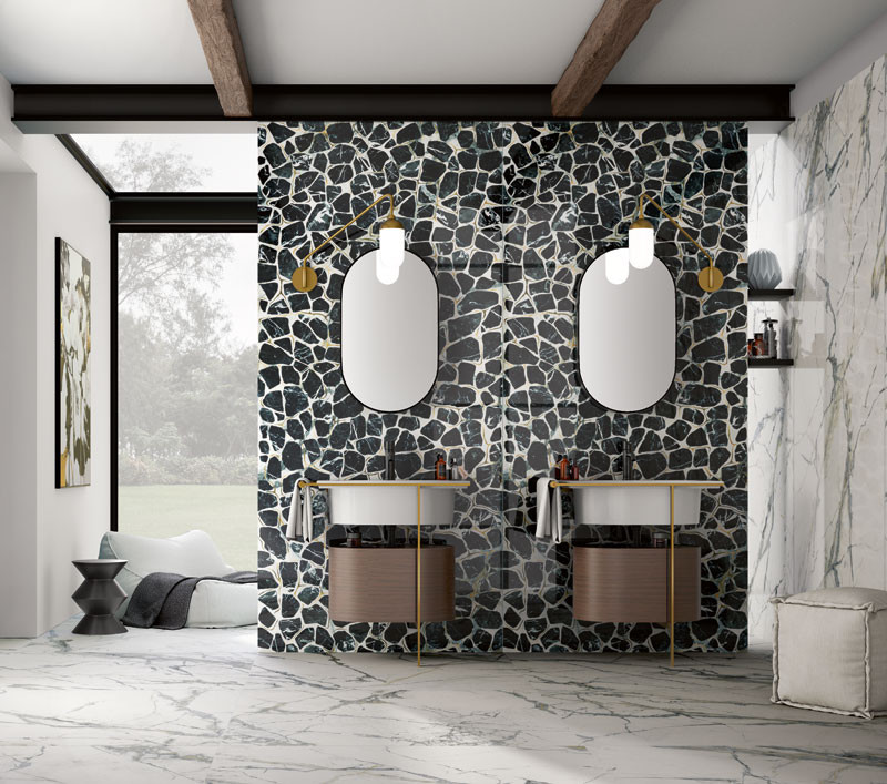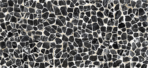 THE ROOM Turtle 120x260- Ez a nagy csempe a teknős páncélját idézi fehér, bézses háttérrel és sötétbarna-fekete mintákkal, arany csíkokkal kiemelve. Tisztaságot, megbízhatóságot és eleganciát sugall.