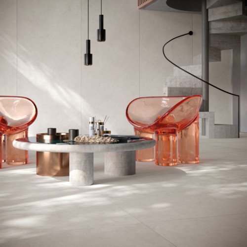 VICEVERSA COCO- 120x278- A beton- és cementhatású nagy csempe elegáns, finom textúrákkal, amelyek a kézműves anyagok jellegét idézik. Krémes árnyalata visszaveri a fényt, optikailag tágítja a teret, nyugodt, derűs légkört teremtve.